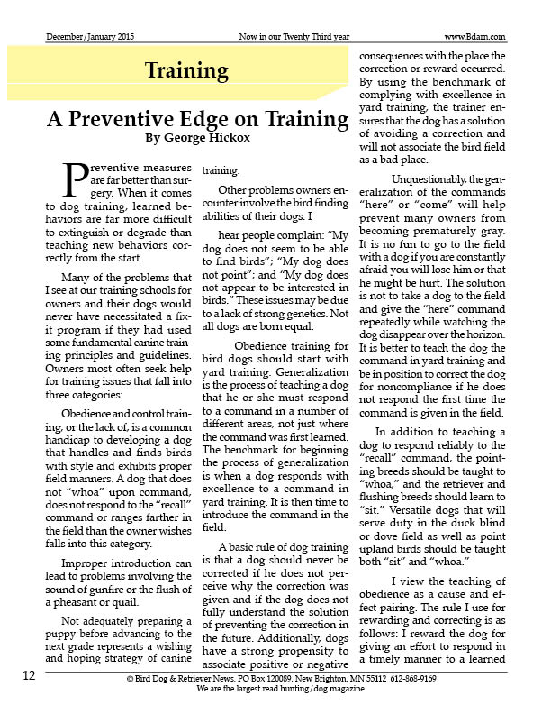 Obedience training for bird dogs should start with yard training. Generalization is the process of teaching a dog that he or she must respond to a command in a number of different areas, not just where the command was first learned. The benchmark for beginning the process of generalization is when a dog responds with excellence to a command in yard training. It is then time to introduce the command in the field.