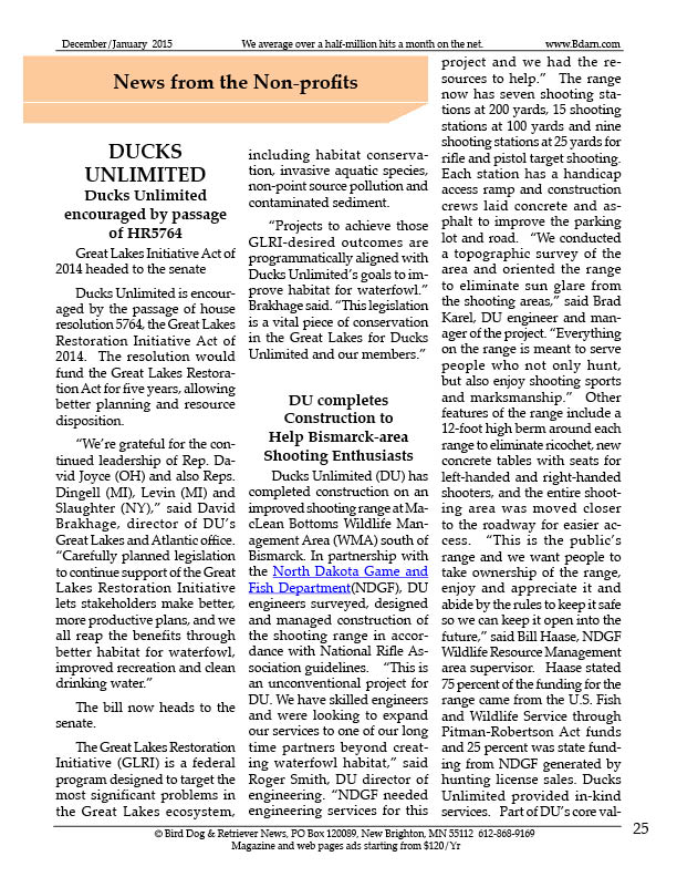 Ducks Unlimited is encouraged by the passage of house resolution 5764, the Great Lakes Restoration Initiative Act of 2014. The resolution would fund the Great Lakes Restoration Act for five years, allowing better planning and resource disposition.