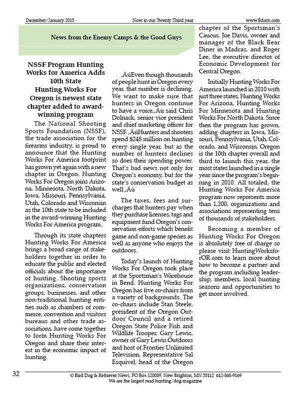 The National Shooting Sports Foundation (NSSF), the trade association for the firearms industry, is proud to announce that the Hunting Works For America footprint has grown yet again with a new chapter in Oregon. Hunting Works For Oregon joins Arizona, Minnesota, North Dakota, Iowa, Missouri, Pennsylvania, Utah, Colorado and Wisconsin as the 10th state to be included in the award-winning Hunting Works For America program.