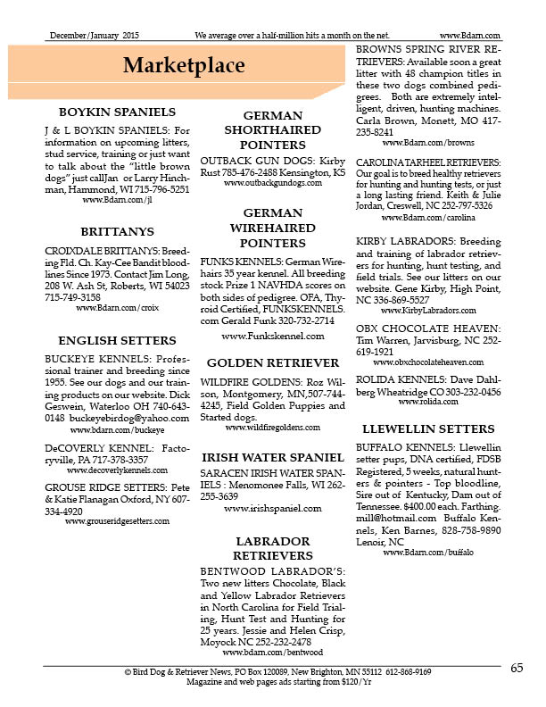 BUCKEYE KENNELS: Professional trainer and breeding since 1955. See our dogs and our training products on our website. Dick Geswein, Waterloo OH 740-643-0148 buckeyebirdog@yahoo.com