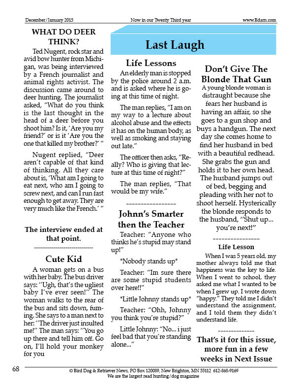 Ted Nugent, rock star and avid bow hunter from Michigan, was being interviewed by a French journalist and animal rights activist. The discussion came around to deer hunting. The journalist asked, "What do you think is the last thought in the head of a deer before you shoot him? Is it, 'Are you my friend?' or is it 'Are you the one that killed my brother?' "